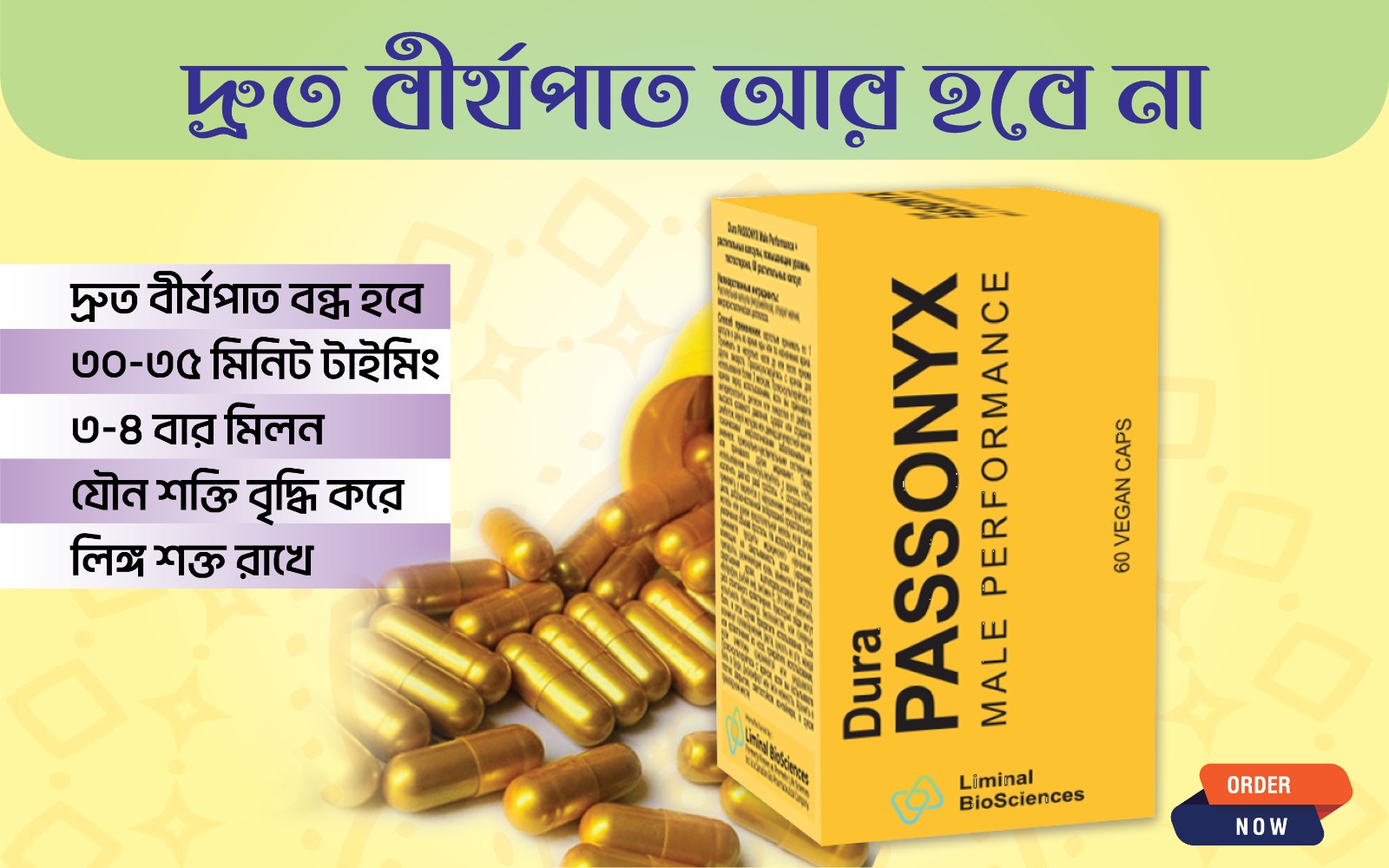 Dura Passonyx (ডুরা প্যাসনিক্স) একটি অরিজিনাল কানাডার পণ্য। এটার প্রধান কাজ হচ্ছে লিঙ্গ মোটা করা,লম্বা করা,সময়টাকে বৃদ্ধি করা,ভিতর থেকে শুক্রানু তৈরী করা।